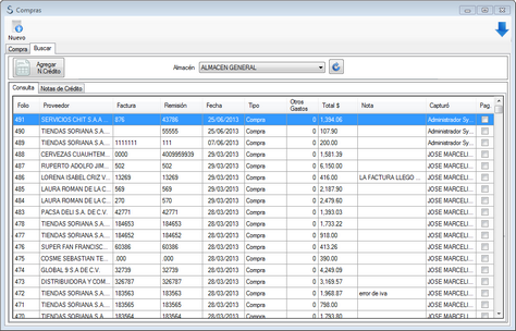 En la Pestaña Buscar encontrara las compras con Notas de Crédito Generadas y Pendientes, se Identifican con un color en el folio :