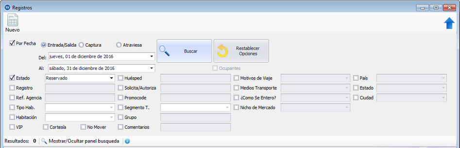 2. Por default el sistema tendrá seleccionado algunas opciones "Por fecha de Entrada y Salida" y la opción "Reservado" mantenga seleccionadas estas opciones y oprima el botón Buscar 3. Obtendrá todas los registros con fecha de entrada actual, Seleccione el nombre del huésped al que le dará CheckIn y presione Doble clic o Clic derecho > Ver registro